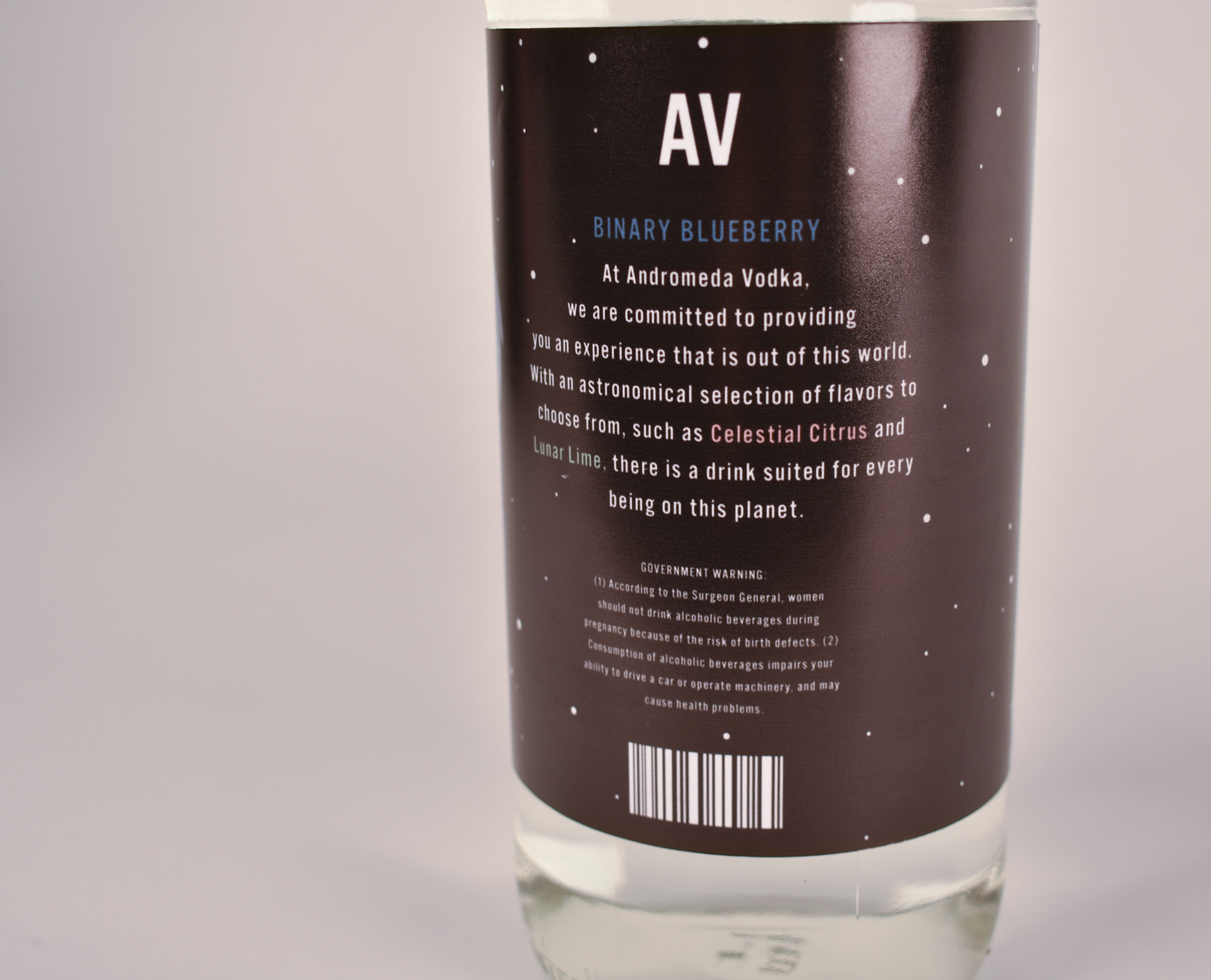 BRANDING & PACKAGING | Andromeda Vodka is galaxy-themed vodka brand with flavors such as Celestial Citrus, Lunar Lime and Binary Blueberry. The packaging is colorful and stands out on a shelf; attracting the market segment of men and women in their early 20s.